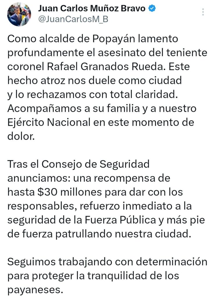 En su mensaje, el mandatario afirmó: “Como alcalde de Popayán lamento profundamente el asesinato del teniente coronel Rafael Granados Rueda. Este hecho atroz nos duele como ciudad y lo rechazamos con total claridad. Acompañamos a su familia y a nuestro Ejército Nacional en este momento de dolor.”