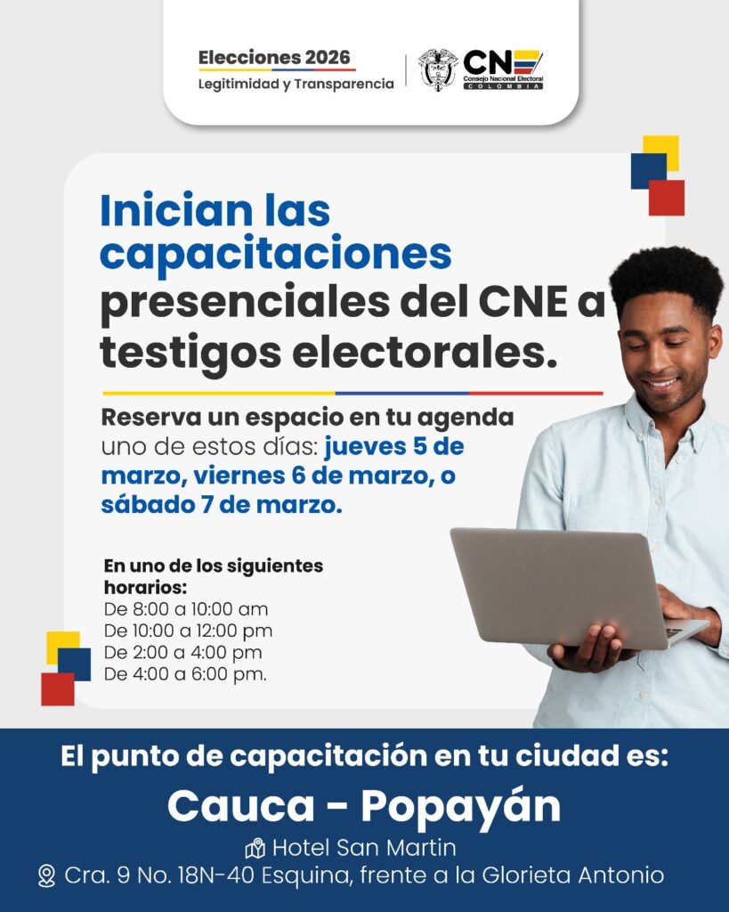 A partir de mañana, el Consejo Nacional Electoral (CNE) dará inicio en Popayán a las jornadas de capacitación dirigidas a testigos electorales, en el marco del fortalecimiento de las garantías democráticas y la transparencia del proceso electoral.