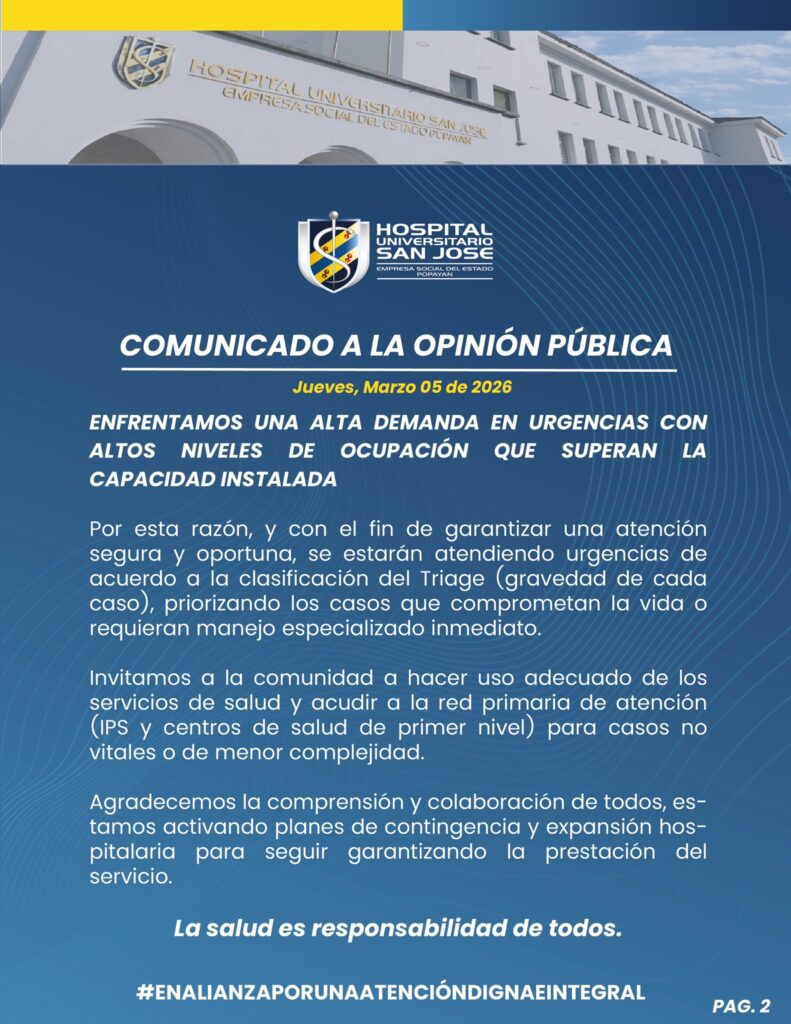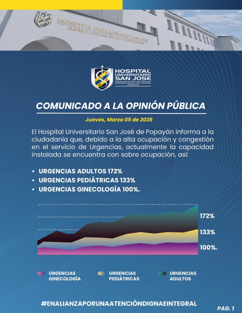 El Hospital Universitario San José de Popayán E.S.E, informa a la ciudadanía que el servicio de Urgencias presenta alta ocupación