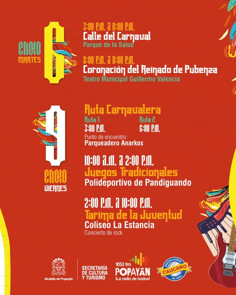 Entre el viernes 9 y el sábado 10 de enero, regresan actividades tradicionales como los juegos populares, la Tarima de la Juventud —con conciertos de rock—, la Ruta Carnavalera y el Gran Concierto de Pubenza, que se realizará en el Estadio Ciro López y se extenderá hasta la madrugada.