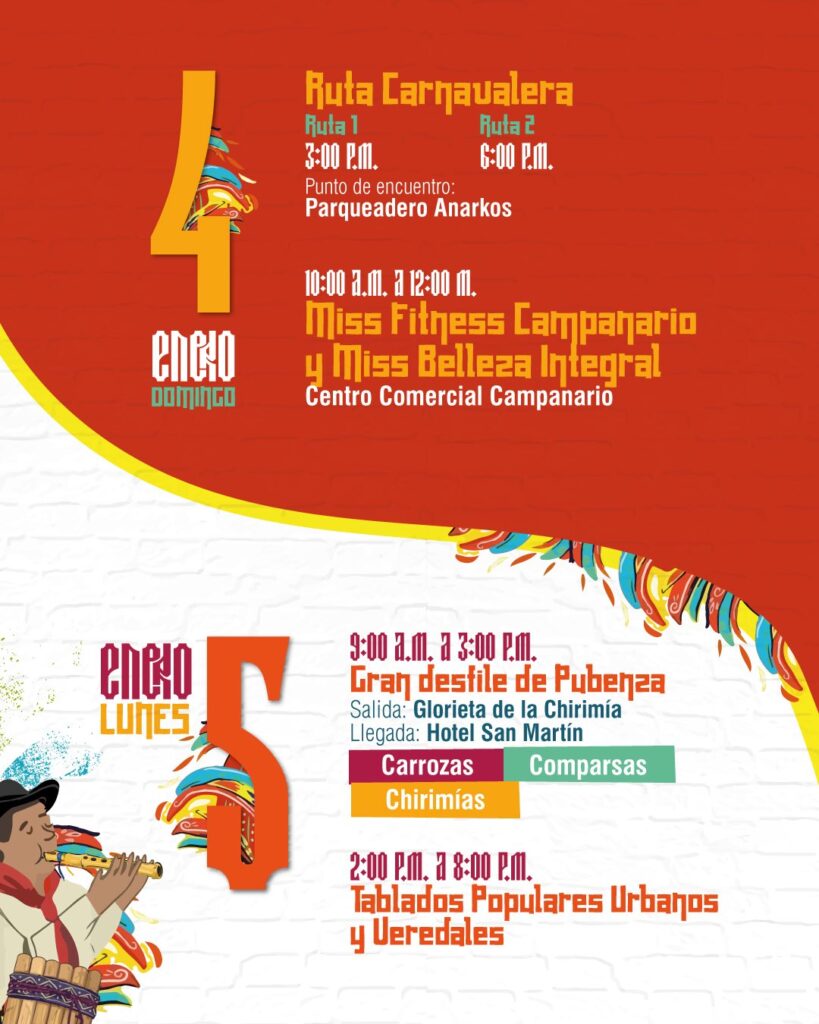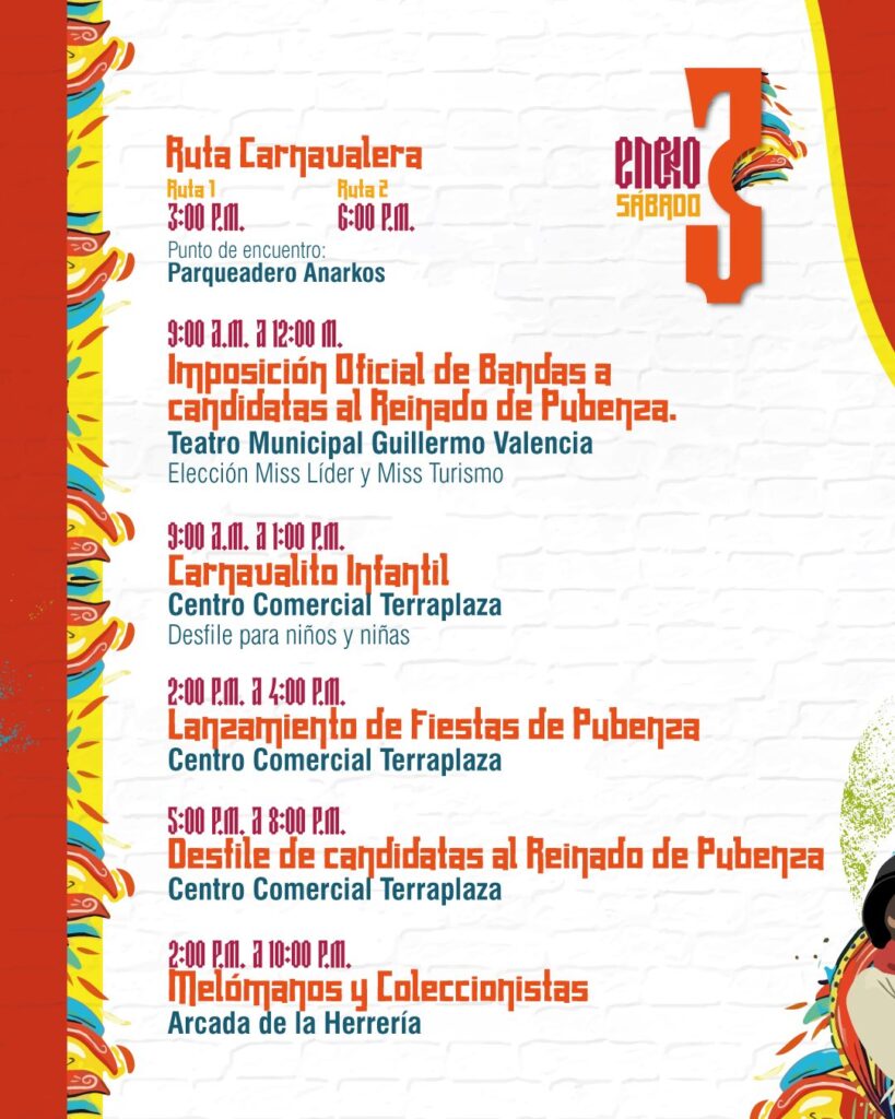 La agenda inicia el sábado 3 de enero con el lanzamiento oficial de las fiestas, el Carnavalito Infantil, la imposición de bandas a las candidatas al Reinado de Pubenza y el desfile de aspirantes, además de la Ruta Carnavalera en horas de la tarde.