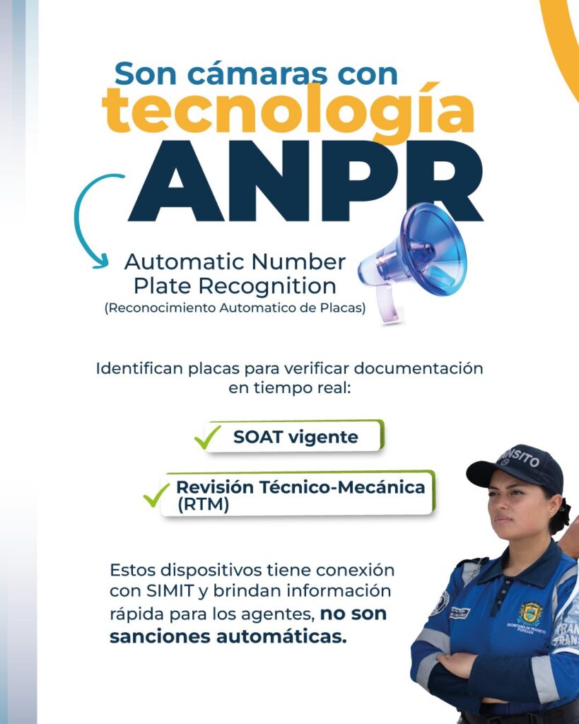 La Secretaría de Tránsito de Popayán inició pruebas piloto con cámaras ANPR (Automatic Number Plate Recognition), una tecnología que permitirá fortalecer el control vial y apoyar la labor de los agentes de tránsito en distintos puntos de la ciudad.