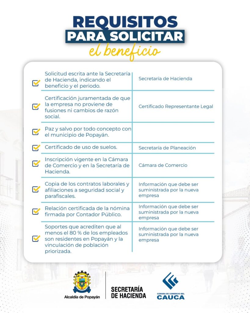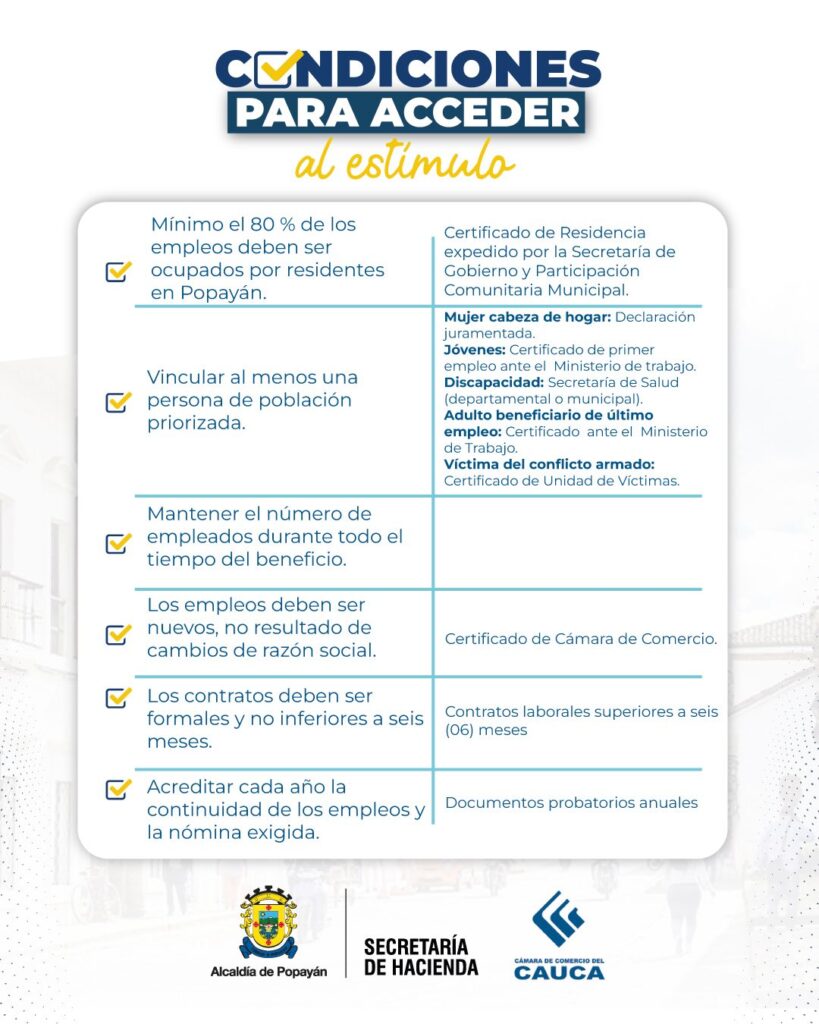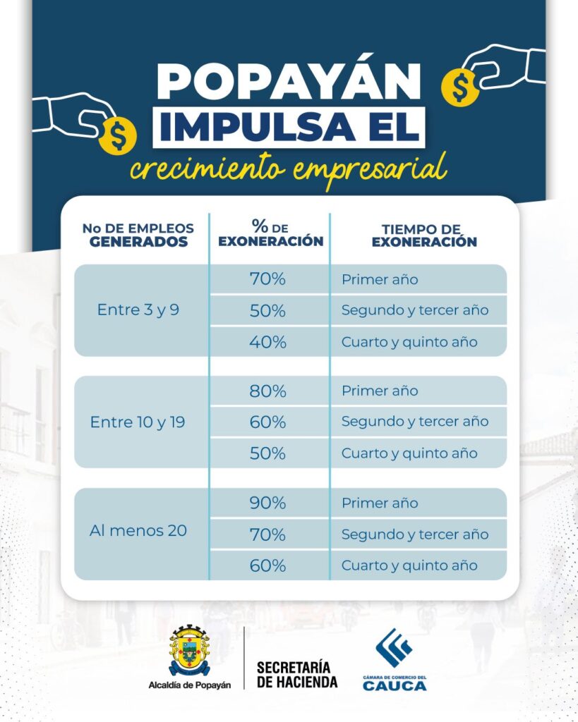 El esquema de incentivos contempla exoneraciones progresivas que pueden alcanzar hasta el 90 % durante el primer año, siempre que las empresas cumplan con los requisitos establecidos, entre ellos que al menos el 80 % de los empleos sean ocupados por residentes de Popayán y que se vincule población priorizada como jóvenes, mujeres cabeza de hogar, personas con discapacidad, víctimas del conflicto armado o beneficiarios de último empleo.