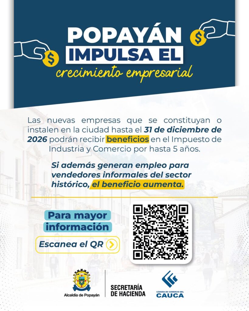 Las nuevas empresas que se constituyan o se instalen en Popayán antes del 31 de diciembre de 2026 podrán acceder a beneficios en el Impuesto de Industria y Comercio (ICA) hasta por cinco años, de acuerdo con el número de empleos que generen y mantengan en el tiempo.